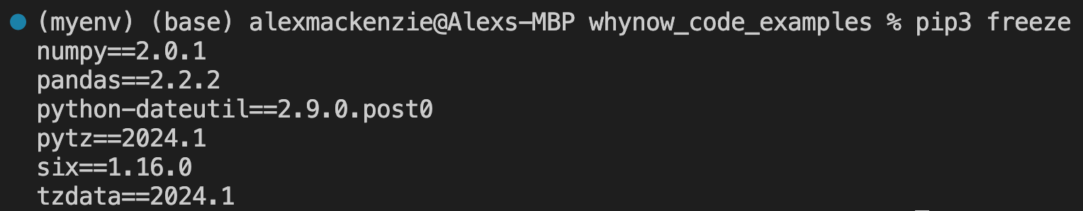 Cool, I’m now “inside” my developer environment called “myenv”. Just think of developer environments as folders that store the dependencies a specific project requires. See below that “myenv” is a folder in the `whynow_code_examples` directory alongside some other Why Now folders [1][2]: