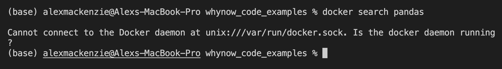 For those unfamiliar with Python / Pandas, the code isn’t important. Just know that I’m using Pandas (the `import pandas as pd` snippet) and it’s running successfully within my shell (i.e. I’m not running into an error message). If I run this code outside of my container, it’d fail.