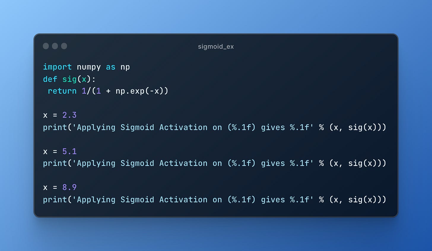 For example, if I pass [2.3, 5.1, 8.9] into the sigmoid activation function: “σ(2.3, 5.1, 8.9)” like so: