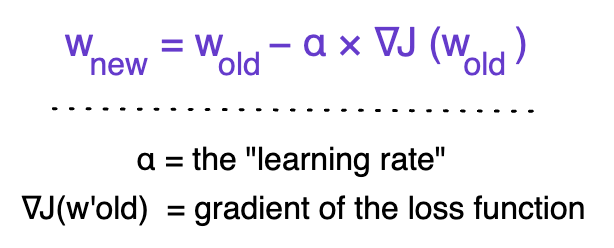 - Gradient descent is the formula above, it calculates the weights/biases to minimise this loss based on a configured leaning rate. Et voilà! We have learning.