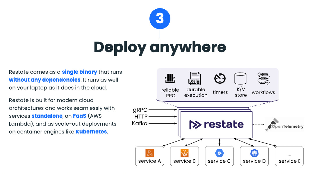 Regarding the image on the right: gRPC (Google RPC), HTTP and Kafka are various protocols that we can use to transport messages/invocations to Restate. We have this down. OpenTelemetry I’ll deal with in a sec.